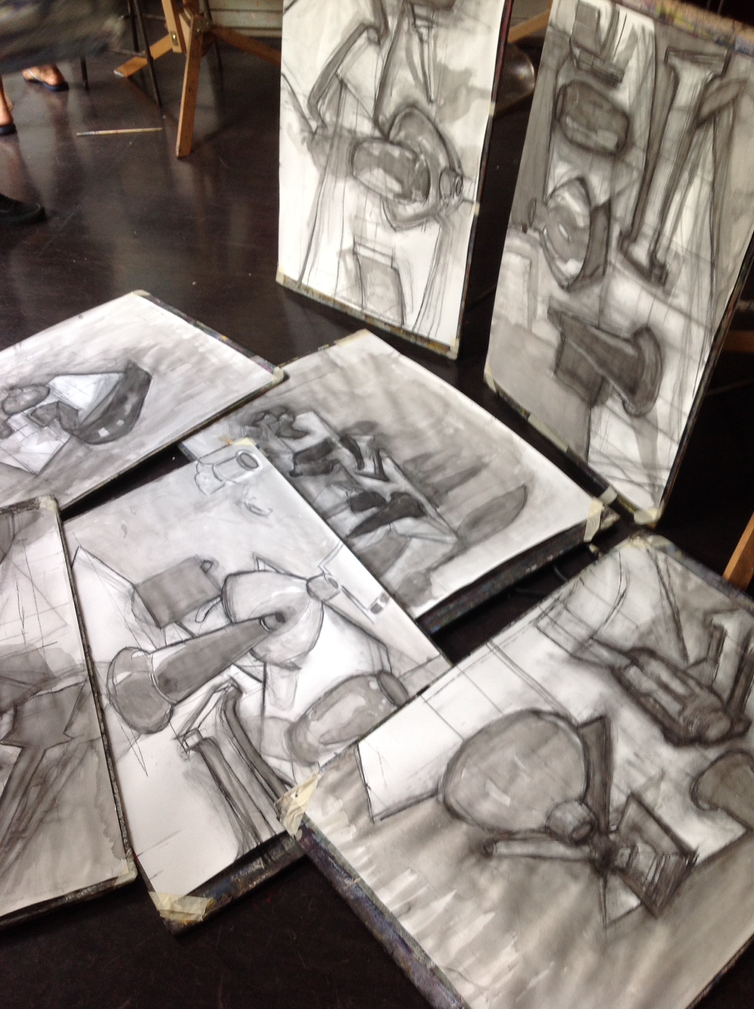 Somehow – not sure how it’s happened – since I started painting I’ve started pressing on really hard with charcoal – making lines that are very heavy and definite. Although having multiple lines on the page makes for a rich texture, what happened this week was a mass of very dark markings followed by even darker definite marks following measuring and moving objects on the paper. Almost like I couldn’t control it. Tony kindly said something he could see from all the markings that I’d worked really hard to get everything right! Yes in that way i made everything feel wrong. Maybe will try not to do heavy lines.