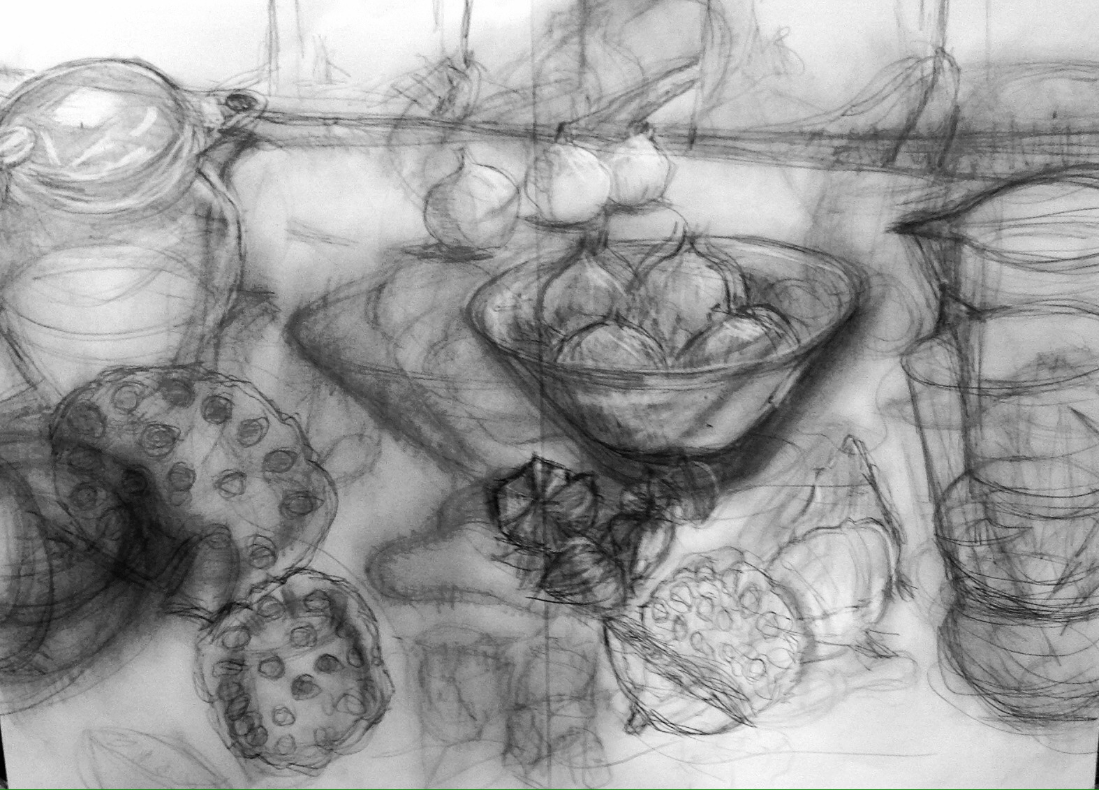 What I learned really came from Tony’s comments during the morning and at the end. He was saying, I think, that I’d ended up with something that represented more than the marks on the page. The objects on the table are there – and I was fairly pleased with what I’d done – but he suggested that I think of the various ghostly images as the history of objects placed for example on the kitchen table. Thinking about that immediately made it more for me. Made me think about further possibilities in relation to the table and to other contexts.