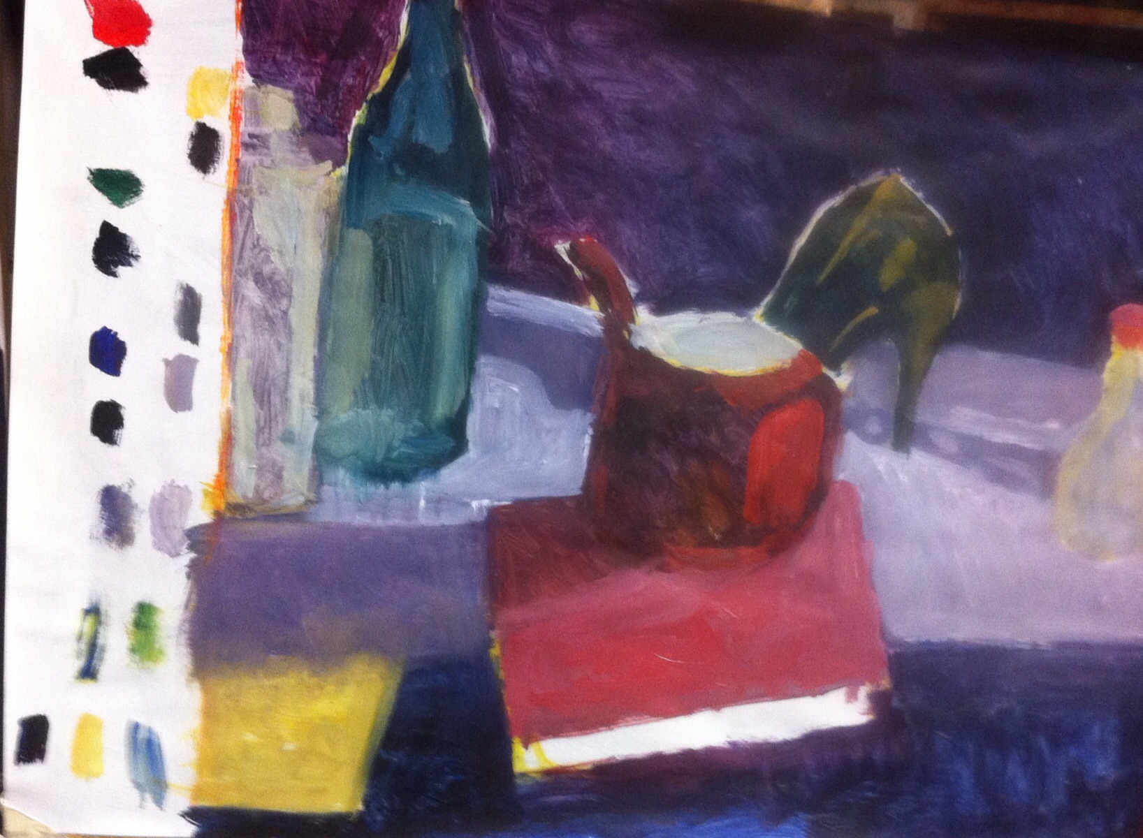We spent 20 minutes mixing colours to match a still life – vibrant red teapot, green and blue bottles, shiny metals, gold and black shoe.