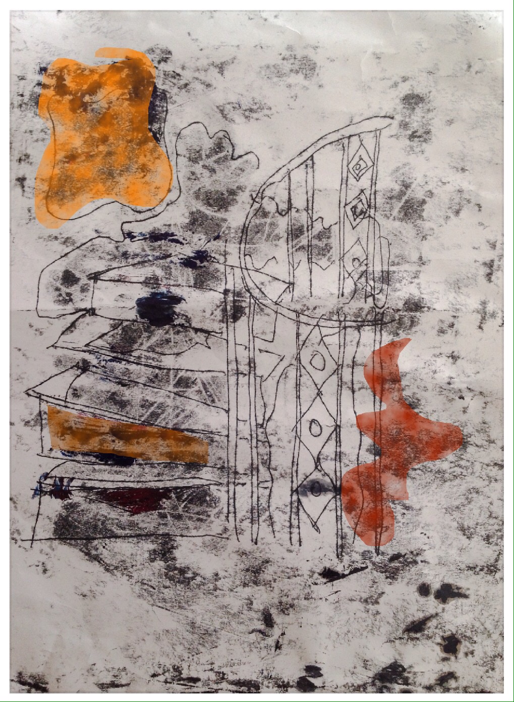 in the afternoon session I took the print I’d done at home of Nantucket trees and printed it white on black paper. It was okay but I think I smudged it each time. I also tried another monoprint based on the ‘pieces of paper drawing’. It took quite a long time to get a good image.