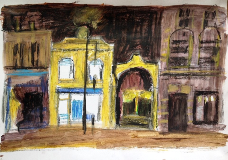 New Cross arch at night, oil pastels